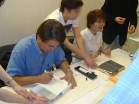 サイン会 ◆サイン会に行ってきました!生の大沢さん、宮部さんに出会えて感激しました。サイン会というものが初めてなもので無様なほどに緊張してしまって、お礼しか言えずとても残念でした。名前って書いてもらえたんですねー。もう何が何やらって感じだったので、もし次の機会があればぜひ…!サインをもらい終えてほっと一息つき、後ろを振り返ってみたならば宮部さんが大沢さんを団扇であおいでおられました。暑い中お疲れ様でした。そして、ありがとうございました! ◆今日は、楽しみにしていた、サイン会に行ってきました。 実は、今日は アルフィーのコンサートでしたが、そっちを蹴って、大沢さん&宮部さんの方に、行きました。だってお二人揃ってのサイン会なんて、めったに、見られないと思います。三省堂での「アルバイト探偵」のサイン会の写真を大沢さんに、渡す事も出来ました。二歳の娘に「沢山並んで疲れた?おなかは空いていない?」と、大沢さん 気にかけて下さいました。やはり実物の方が、カッコイイ。宮部さんは、初めてでしたが、お話が出来て、嬉しかったです。 今回、このような タクラミを企画された事、とても、感謝しています。有難うございます。 P・S 娘は、家族中に、サイン本二冊を見せては、ニコニコと喜んでいます。 ◆サイン会行ってきました!事前に整理券をゲットしこの日を待ちました。しかし、ついた時間はすでに予定時間をはるかに過ぎていて、「終了」が頭をよぎりましたが、心配無用。この時は思いました、混んでて良かったと・・大沢先生とガッチリと握手してもらい、宮部先生とはそっと手を出したらやさしく握手してくれました。二人とも「遅くまでありがとう!」と皆に言っていましたが、いえいえお二人こそ遅くまでご苦労様でした。「私もうちわで扇いでたよ」とぼっそと言った宮部先生がかわいかったです。またぜひ参加します! ●ううう、私も行きたかったですぅぅぅ。(まるひ) |