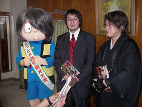 ◆す、素早いです大夫さま いや、先週の今日の出来事が先週の今日のうちにアップされてしまうと今週の今日書くコトがないじゃないですか(笑)。 というわけで、『旧怪談』関係のインタビューを三件ほどサクサクとこなした後、オフィス会議&今年の朗読会の打ち合わせ&読み合わせなんかがあったわけですが、詳しくは先週の「燃えよ山椒大夫」コーナーをどうぞ。 それにしてもオフィスに三人揃うのは今年初めてといわれて、改めてびつくり。そうだっけ? という感じでしたが、そうなんでしょう。まあ、昨日正月だったような気でいたらもう夏ですから、それもしかたがないのかもしれません、はい。 そんなこんなで半年ぶりの会議はけっこう遅くまでかかったわけですが、終了後ワタシは家には帰れなかったわけです、はい。 真っ直ぐ向かったのは羽田空港。朝一のヒコウキに乗らなくちゃいけなかったわけです。げー、いつものパターンだあっはっは。 ◆だ、大丈夫なのかこの連中 で、ホテルで仮眠して出撃。出発ロビーに待ちうけるのは四日家に帰れず風呂にも入っていない怪工作員O、何日も寝てない最終兵器Uさん、同じくすでに限界を迎えているのに原稿が終わっていない徹夜でピンチの村上健司君、それから一人元気なT君。で、最近妙に陽気な悪人編集長G。 なんか、半数以上が半死人。それもそのはず、『怪』もいよいよ大詰めという時期。何もかもが締切り。締切りの舟盛り状態。 機上の人となっても仕事をし続ける村上君、いきおい段取りを打ち合わせはじめるその他の人々。その日、なんだか鬼気迫るものが上空を飛んでいたわけです。 そしてあっというまに到着。いったい何のためにどこに向かったのかといいますと。 ◆せ、「怪遺産」第一回認定! いや、世界遺産じゃございません。ちなみに、昨年の妖怪会議終了後の打ち上げに訪れました石見銀山は、このたびめでたく世界遺産に登録されました。 が、こちらは「怪遺産」であります。 後世に残すべき「怪」的なるもの――妖怪文化の普及推進に貢献した事物を怪遺産として認定しよう、という企画であります。厳正なる審査の結果、記念すべき第一回認定は「境港市」と決定したわけです。 でもって「認定式」なるものを行いに出かけたわけですね、我々は。僕は今回、「世界妖怪協会会長代行」、つまり水木大先生の代役であります。こりゃ大役だ。 認定式は午後からということで、まずは「水木しげる記念館」にご挨拶。兼、打ち合わせ。その後、「鬼太郎茶屋」や「ゲゲゲの楽園」、「妖怪神社」と挨拶回り。 で、昼食後、境港市役所へ。 着いてびつくり! も、ものすごい報道陣が。テレビ各局、新聞各紙の 記者さんたちが市長室にびっしり。 こ、こんな状況になっていたのか。すごいじゃないか、「怪」。 と、いうわけでG編集長から中村境港市長に認定証書が渡されまして、ワタシは観光協会会長でもある舛田水木記念館館長に「妖怪要石楯」(←ただいま命名)をお渡しいたしました。 この楯は、(またまたという感じですが)日本物怪観光の天野行雄さん製作。当日の早朝仕上がってT君が受け取った、できたてのほやほや。